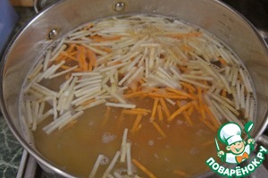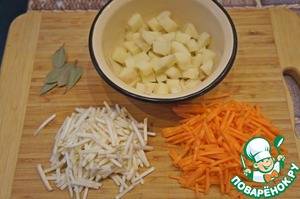 Картофель нарезать кубиками, морковь и сельдерей нашинковать соломкой.