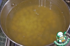 Готовый бульон процедить, мясо отделить от костей, разделить на небольшие кусочки и отложить в сторону, прикрыв от заветривания.