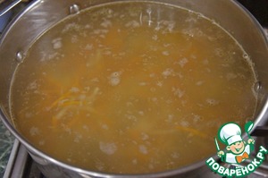 Как только бульон начнет закипать, уменьшить огонь до слабого, тщательно снять пену и посолить.