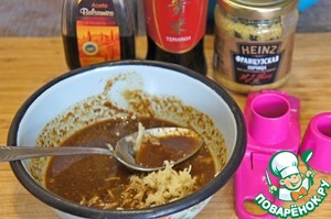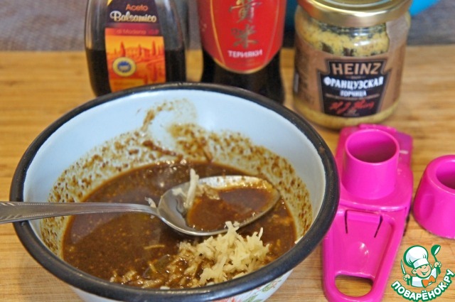 Смешать горчицу, соевый соус и бальзамик. Добавить измельченный чеснок.