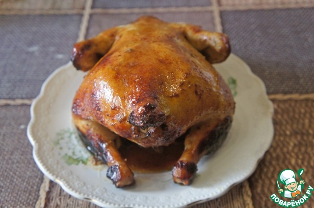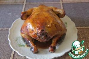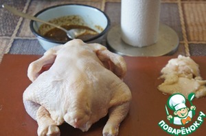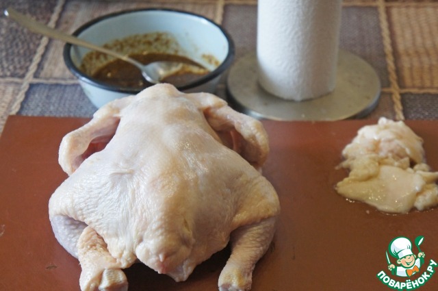 Тщательно и обильно смазать тушку маринадом снаружи и внутри, слегка втереть его в кожу... Другими словами сделать цыпленку массаж. Мариновать тушку 1-2 часа.