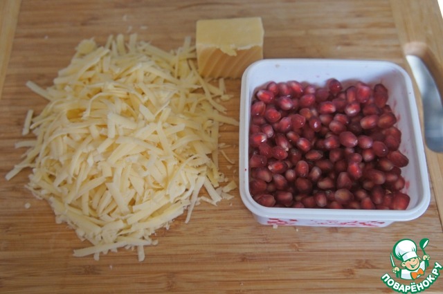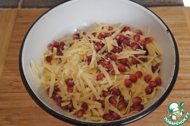 Сыр натереть на крупной терке, гранат очистить, освободив зерна.
