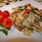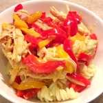 Пасту порционно разложить по тарелкам. Сверху залить соусом с кусочками курицы и перца.