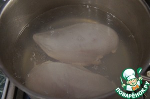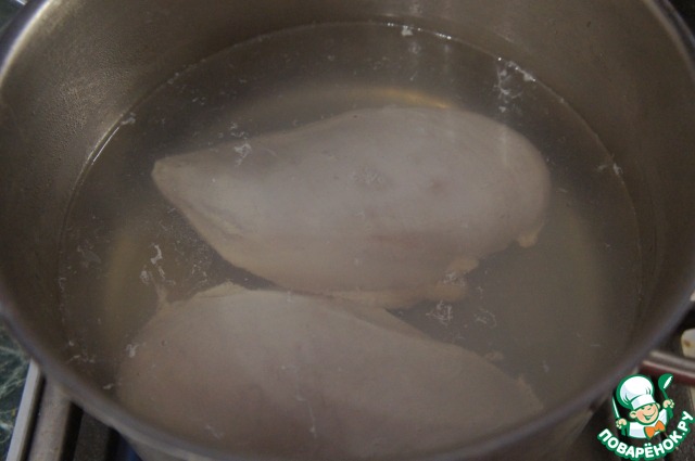 Грудку (обращаю ваше внимание: не 1 филе, а 1 грудку, т. е. 2 филе) отварить в 1 л воды.