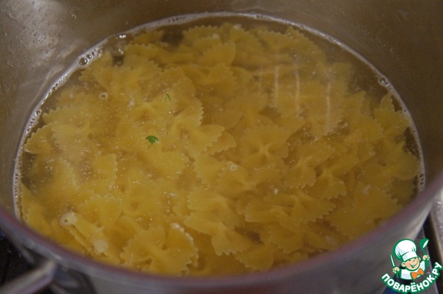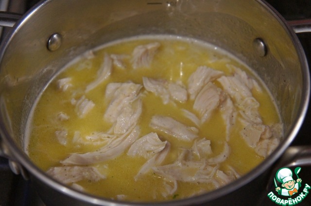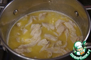 Пасту отварить в оставшемся курином бульоне. Откинуть на дуршлаг.
