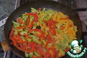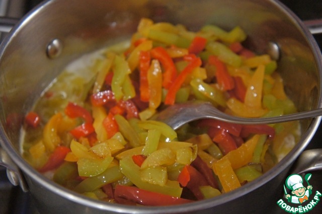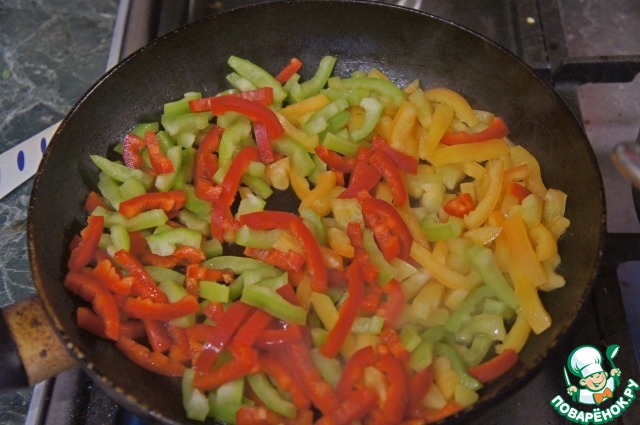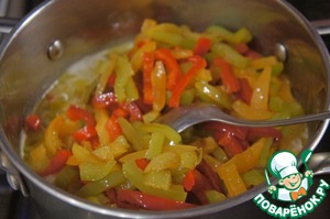 Затем болгарский перец. Держать на огне 5 минут, помешивая.