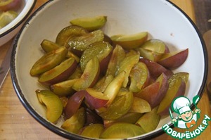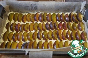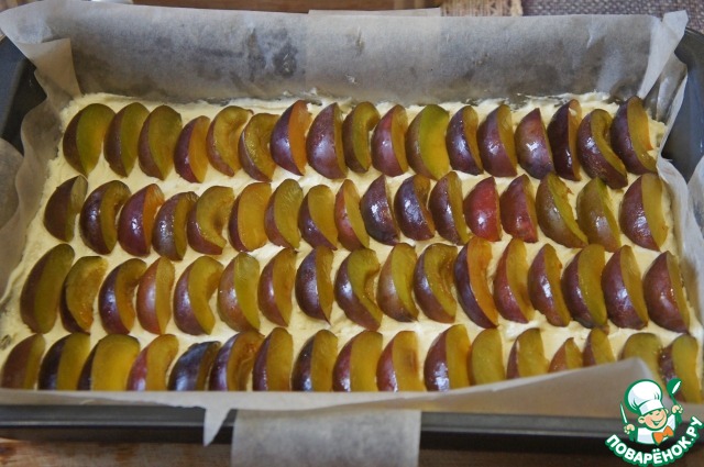 Сверху плотно рядами выложить сливы, не вдавливая в тесто. -