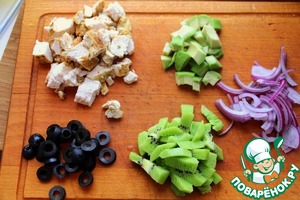 Нарезать грудку, маслины, авокадо, киви, лук