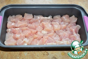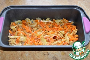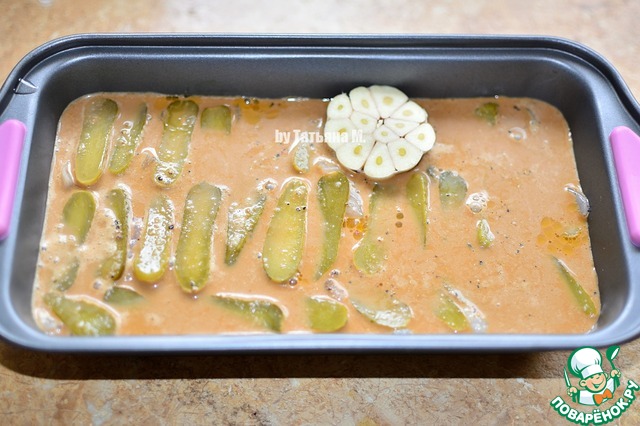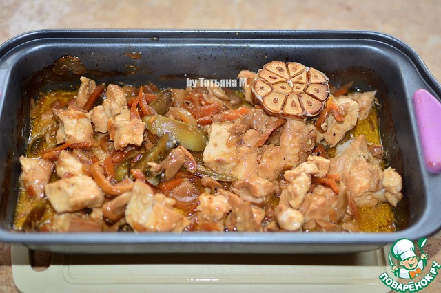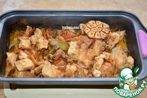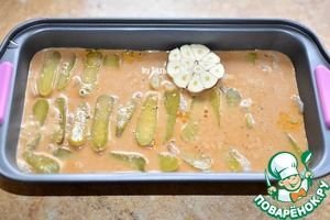 Залить соусом содержимое формы, сверху положить половинку головки чеснока;