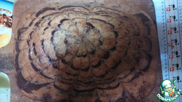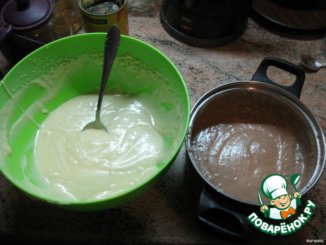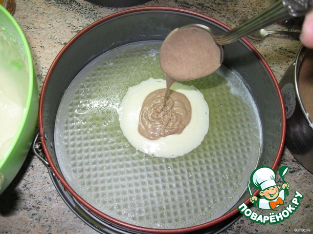 9. Теперь берем ложку "темного" теста и выливаем наверх и в середину "белого" теста. Так и льем друг в друга, пока не кончится тесто.