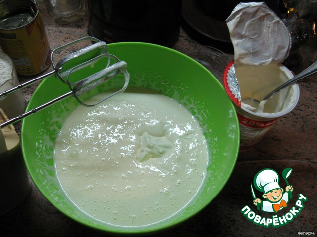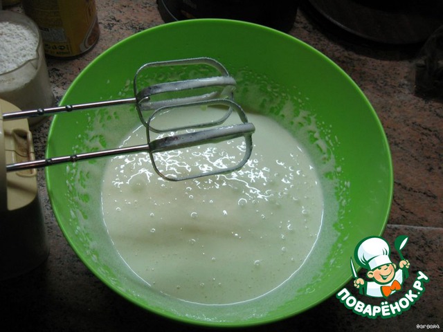 4. Понемногу всыпаем муку и мешаем миксером, чтобы получилось "без комочков".