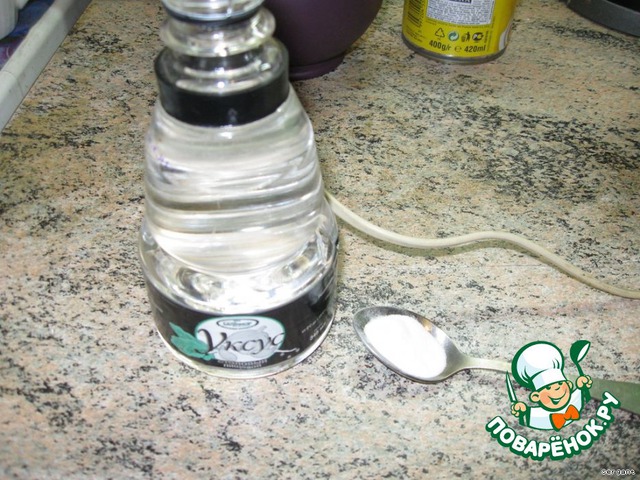 5. Добавляем или 1 чайную ложку разрыхлителя для теста, или просто "гасим" половину столовой ложки соды ("гасим" - это значит заливаем уксусом, чтобы зашипело, но БЕЗ ФАНАТИЗМА).