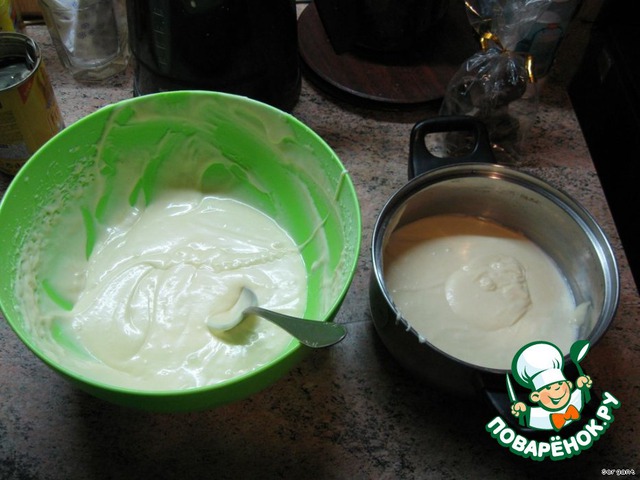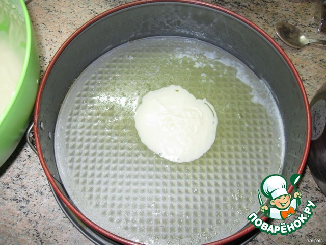 8. Теперь нам предстоит наполнить форму для выпечки нашим тестом. Как совет - сразу расположите на столе две емкости с тестом (в каждую емкость положите по чистой столовой ложке) и посередине, между ними, форму для выпечки. В форме растопите чуток сливочного масла, чтобы смазать дно.