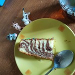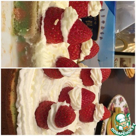 Иногда доделываю его: разрезаю его пополам вдоль, пропитываю сладкой сметаной с йогуртом (Чудо-йогурт в красной бутылке), а сверху кремом украшаю и фруктами.
