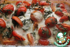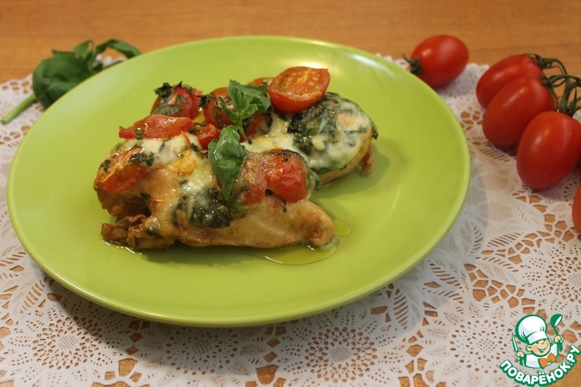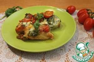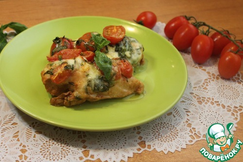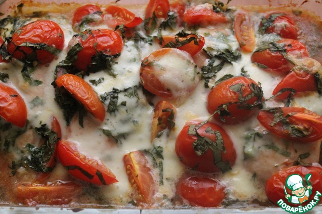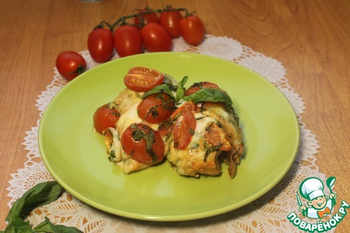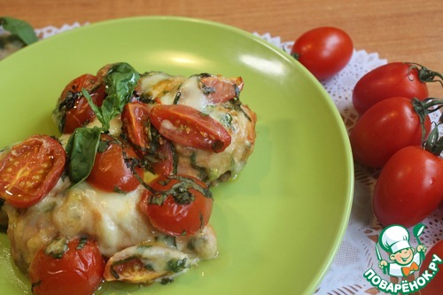 Когда мясо промаринуется, достаем его из холодильника, выкладываем в форму (грудки можно обтереть, но я не стала этого делать). Сверху кладем в хаотичном порядке смесь из черри, моцареллы и базилика.