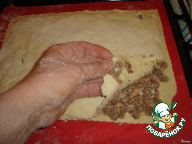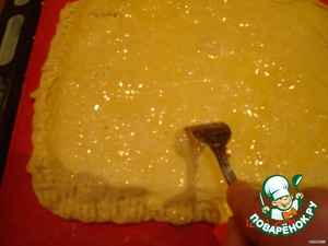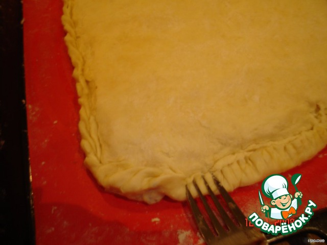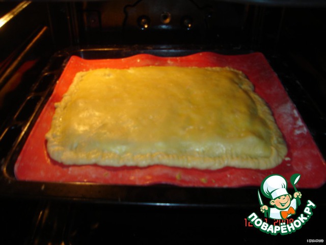 Верх пирога смазать желтком и наколоть в нескольких местах вилкой.