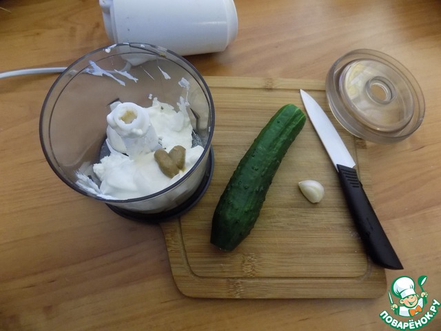 Делаем заправку к салату. В блендер выкладываем творог, сметану, горчицу и солим. Чеснок чистим и режем вместе с огурцом.