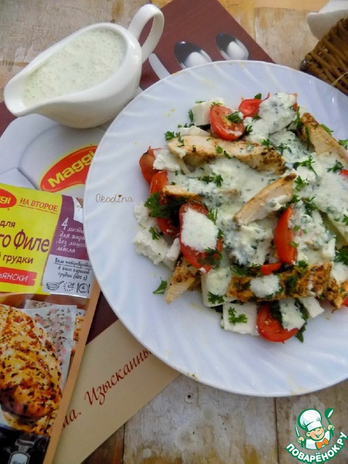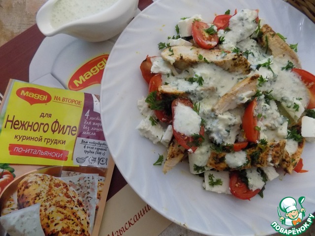 Предлагаю вам попробовать полезный и очень вкусный салат, сделанный из нежной грудки, обжаренной в листах Maggi по-итальянски, черри и феты. Салат заправлен необыкновенной заправкой, которая состоит из огурца, творога, сметаны и горчицы. Полезнейшее блюдо!