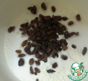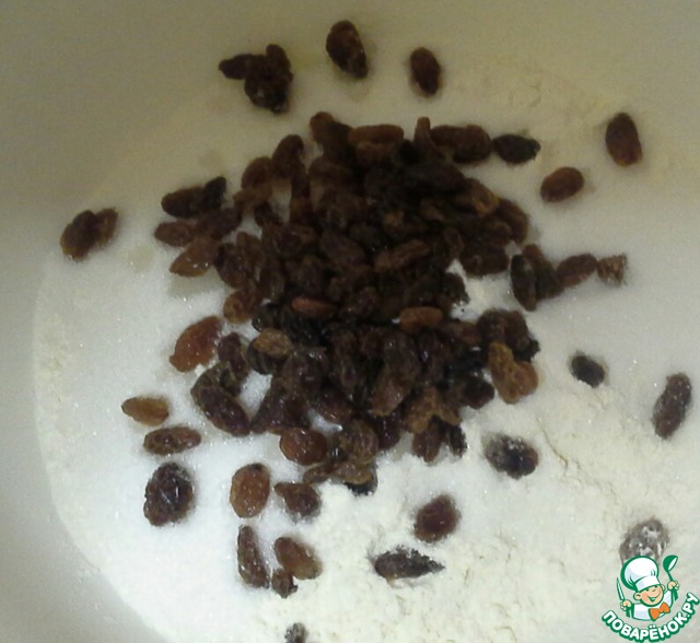 В одной миске смешать муку сахар и изюм. Добавить соду и уксус.