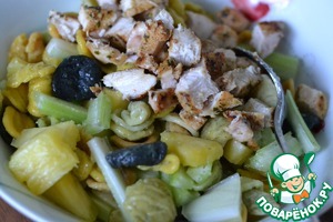 К теплым макаронам выкладываем кусочки куриного филе, сельдерей и ананас. Перемешать.