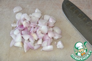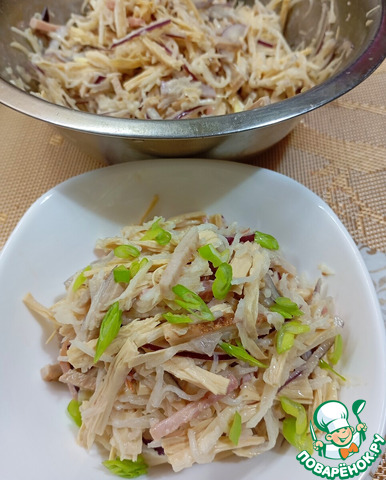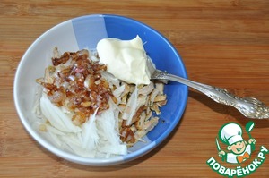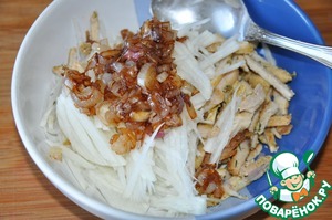 Смешиваем в миске редьку, куриное филе и карамелизированный лук.