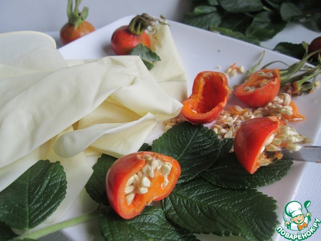 Для защиты рук используем перчатки. Шиповник чистим от семян и волосков, разрезая плоды пополам. Затем плоды тщательно промываем несколько раз меняя воду.