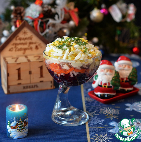 Последний слой салата – свекла. Аккуратно выложить ее сверху и утрамбовать.