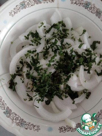 • Лук порезать полукольцами, петрушку мелко порубить.