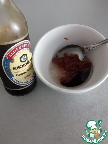 • Смешиваем, томат, уксус, масло, соль, соевый соус.