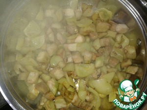 Баклажаны помыть, очистить от кожицы, порезать на кубики 1,5см, добавить к зажарке. Все овощи обжариваем совсем немного, пару раз помешав, добавляем в сковороду обязательно последовательно, а не все вместе.