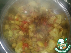 Помидор помыть, порезать мелко, выложить на сковороду. Добавить специи по вкусу. У меня смесь перцев, неплохо подойдет хмели-сунели. Посолить, немного потушить до полного выпаривания сока из помидор.