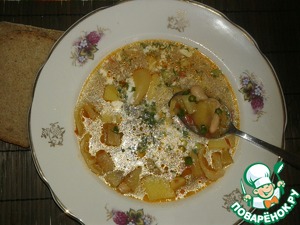 Подаем суп, приправляя сметаной и рубленой зеленью по вкусу.