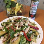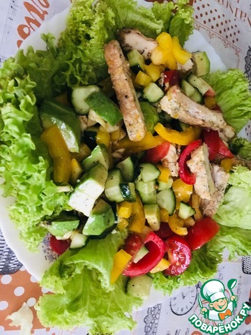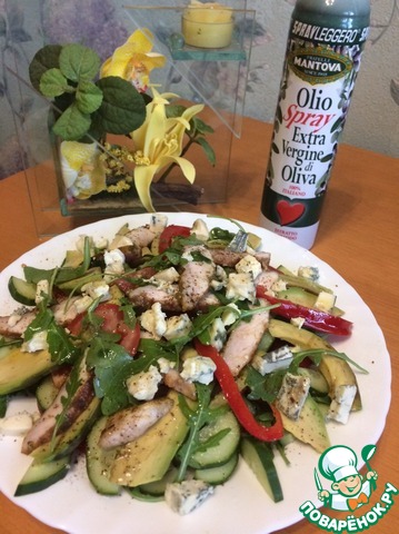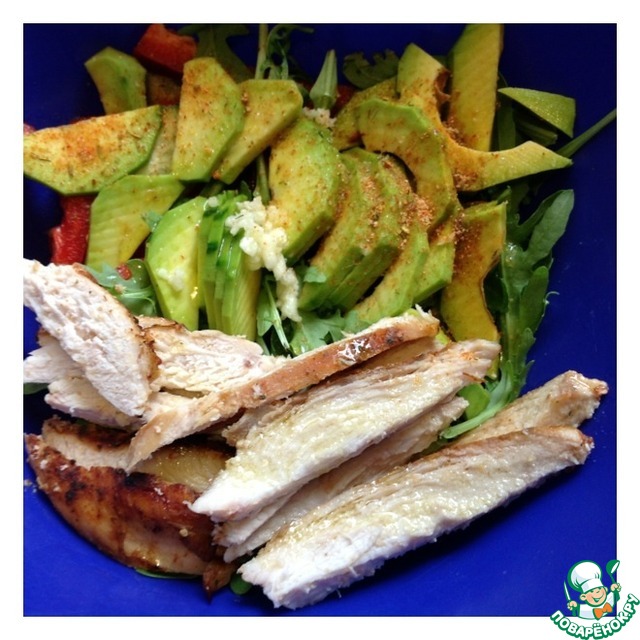 Готовую грудку нарезать небольшими пластами, чеснок пропустить через пресс. Добавить оливковое масло и соль. Авокадо очистить и нарезать тонкими полу пластинками, сразу сбрызнуть лимонным соком. Салат аккуратно перемешать.