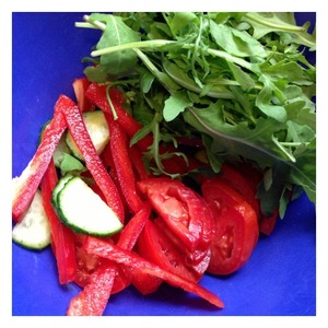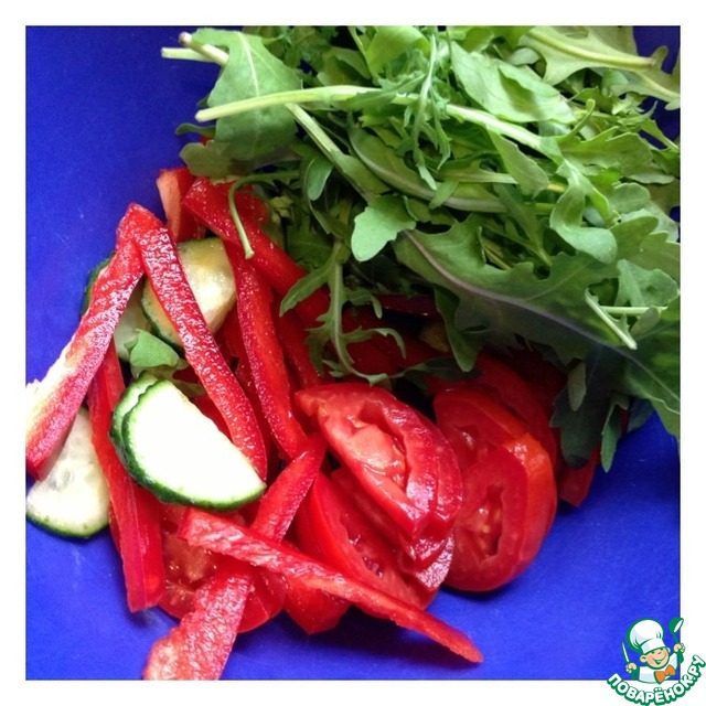 В салатник выложить рукколу. Огурец и помидор нарезать пластинками, перец тонкой соломкой.