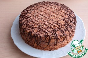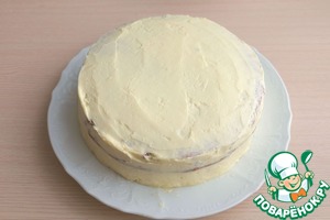 Коржи пропитать любым фруктовым сиропом. Смазать бисквитные коржи и боковые поверхности приготовленным кремом.
