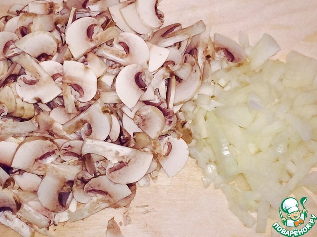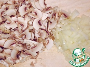 Нарезаем грибы и лук, обжариваем их на сливочном масле 5-7 минут.
