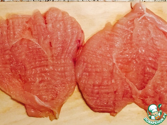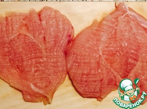 Куриное филе разрезаем "книжкой" и слегка отбиваем тыльной стороной ножа