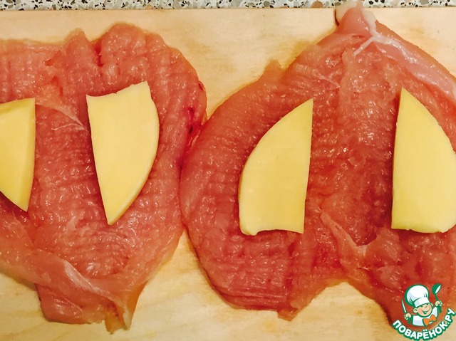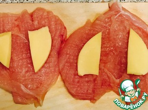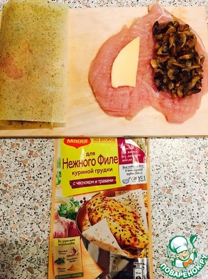 На сыр выкладываем грибы, складываем филе "в закрытую книгу". Выкладываем готовые рулеты в листы для жарки