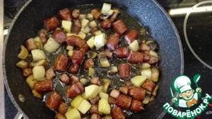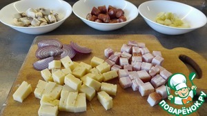 Нарезаем кубиками, не мелкими, но и не сильно крупными. Колбаски длиной примерно 2 см, лук полукольцами толщиной не менее 5 мм.