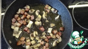 На разогретую на среднем огне сковороду наливаем масло, выкладываем бекон, обжариваем до лёгкой золотистой корочки. Добавляем грибы.