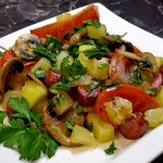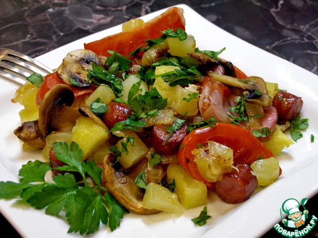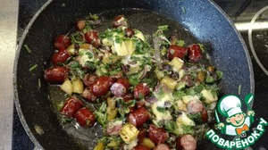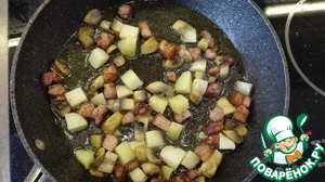 Грибочки слегка обжариваем, даём впитаться в них ароматному маслу. Добавляем картошку.