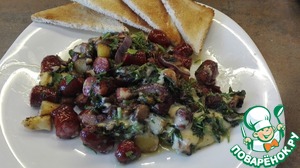 Сверху выкладываем сыр. Сыр плавить не нужно, он должен только чуть-чуть подплавиться, но держать форму. Я прозевал этот момент и сыр поплыл. Сверху притрушиваем крупно нарезанной петрушкой, выдерживаем буквально 30 сек и снимаем с огня.