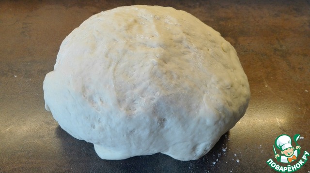 Количество всех ингредиентов приведено из расчёта на два пирога!!! Приготовим сдобное тесто. Муку просеем в глубокую миску. Добавим все сухие ингредиенты - дрожжи, соль и сахар. Перемешаем и сделаем углубление. Разобьем яйцо, нальем теплое молоко и теплую воду, а также растопленный маргарин или сливочное масло. Вымешиваем тесто в течении 5 минут. Тесто должно быть немного липким. Уберем в теплое место на 1,5 или 2 часа. Получается вот такое тесто