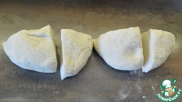 Тесто разделим на две части. Каждую часть разделим еще на две неравные части.