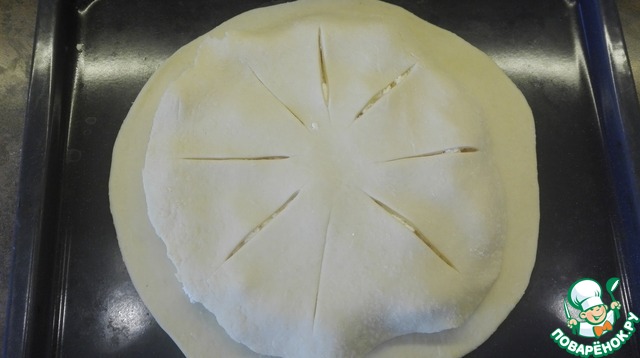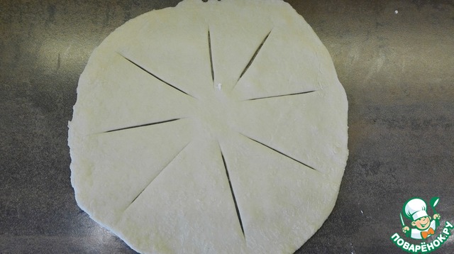Раскатаем меньшую часть в круг 25 см. Сделаем надрезы.