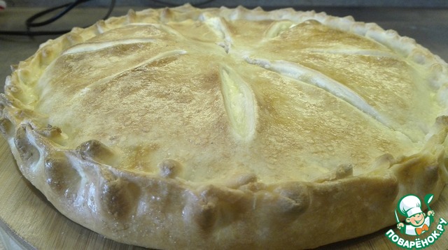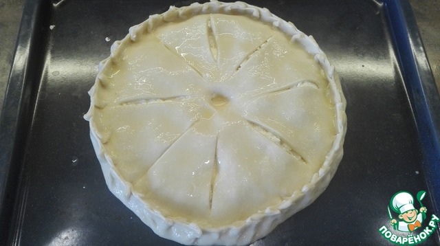 Далее защипываем края косичкой. По центру делаем дырочку для выхода пара. Смажем лепешку яйцом и отправим в разогретую до 200°C духовку на 25 минут.