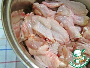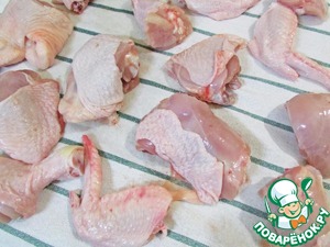 Курицу разрубить на небольшие кусочки. Затем помыть и хорошо обсушить на полотенце. Можно использовать уже нарубленные части курицы: бедра, окорочка, крылышки.