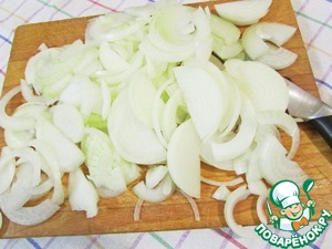 Репчатый лук (чем больше, тем лучше) почистить и нарезать полукольцами.