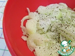 Кольца лука выложить в миску. Посолить, поперчить и добавить щепотку сахара. Всё хорошо перемешать руками.