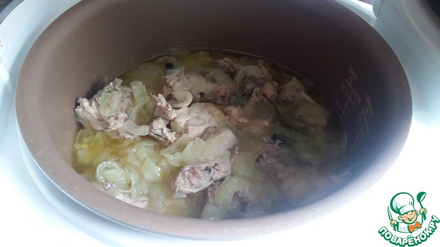 Сверху выложить подготовленный лук. Кастрюлю накрыть крышкой, поставить на медленный огонь и забыть про неё на целый час))) Этим временем можно заняться мелкими домашними делами, позаниматься с ребенком, или Просто отдохнуть.